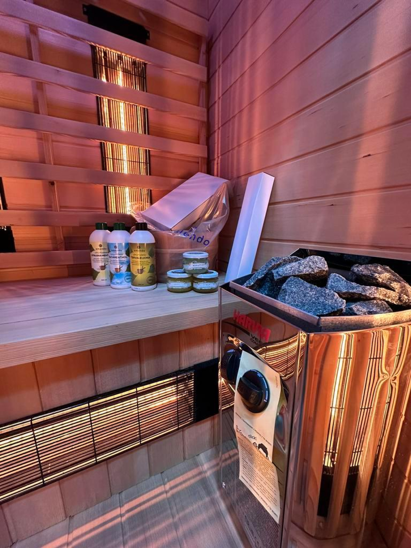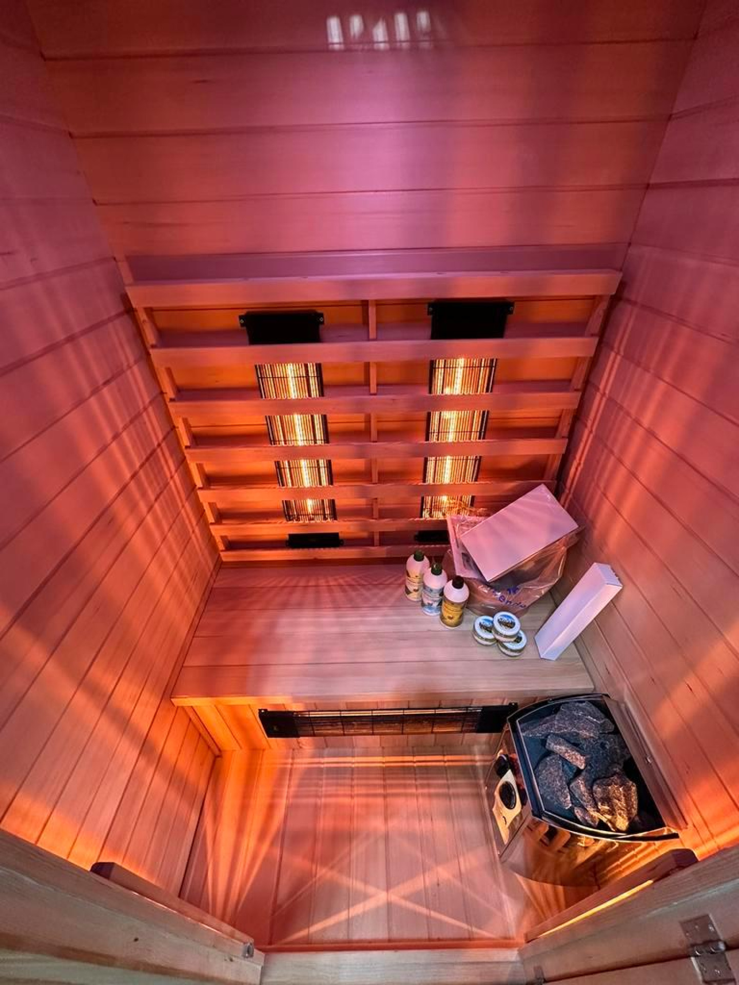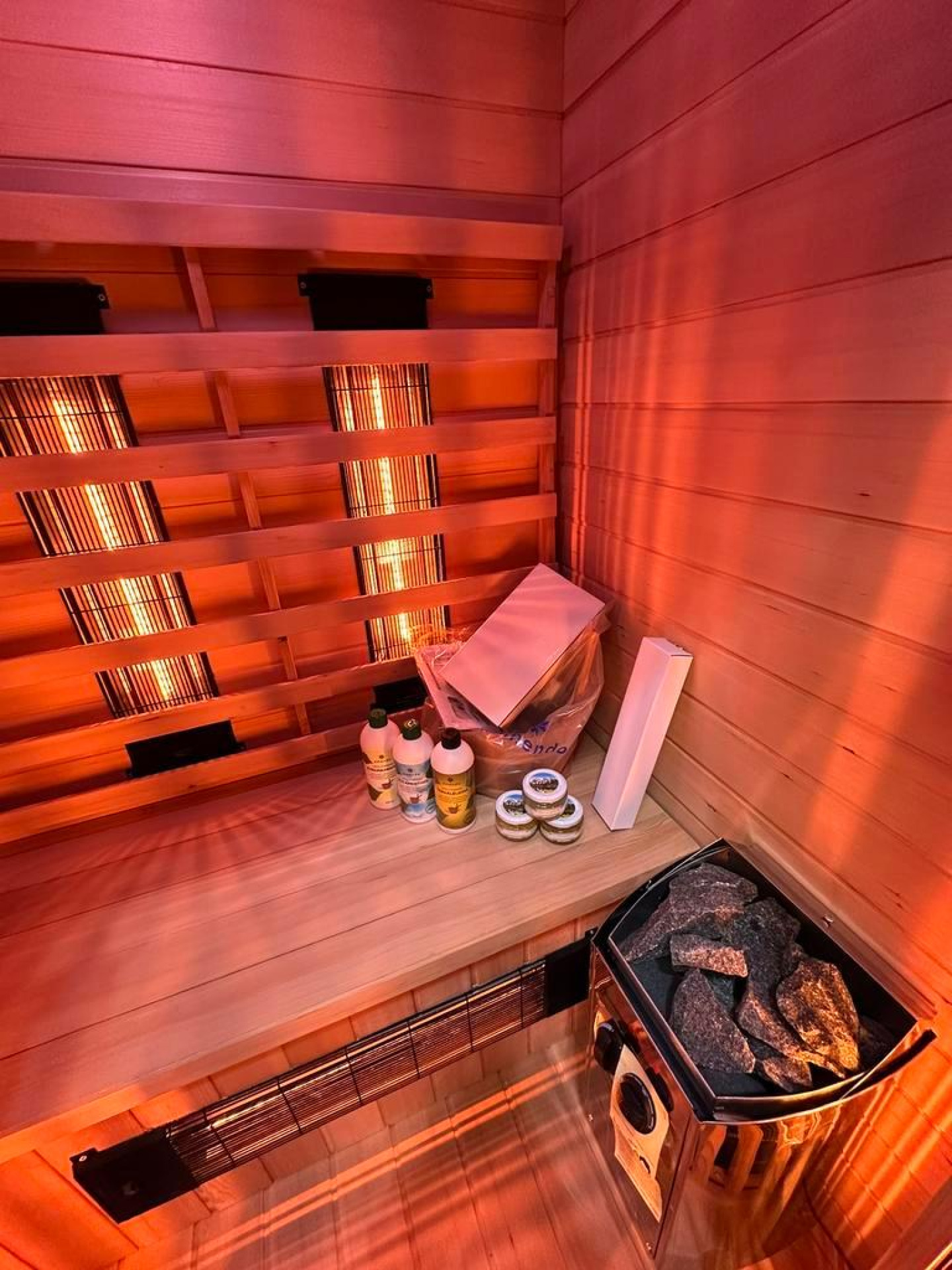 Super combi sauna met duo golf (korte en lange) stralers + finse opgietkachel.