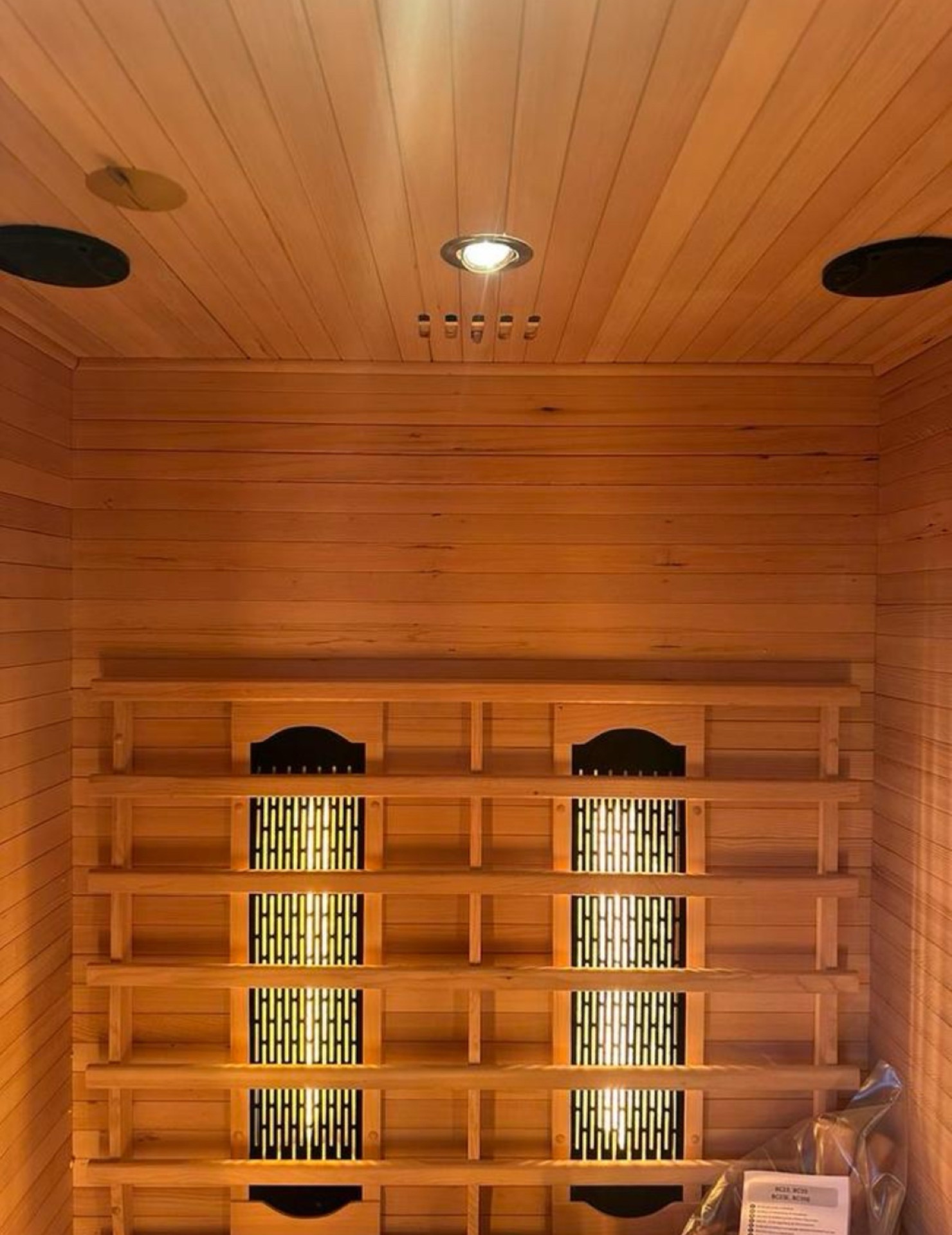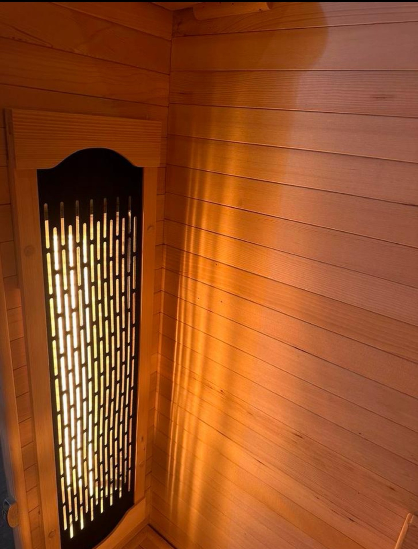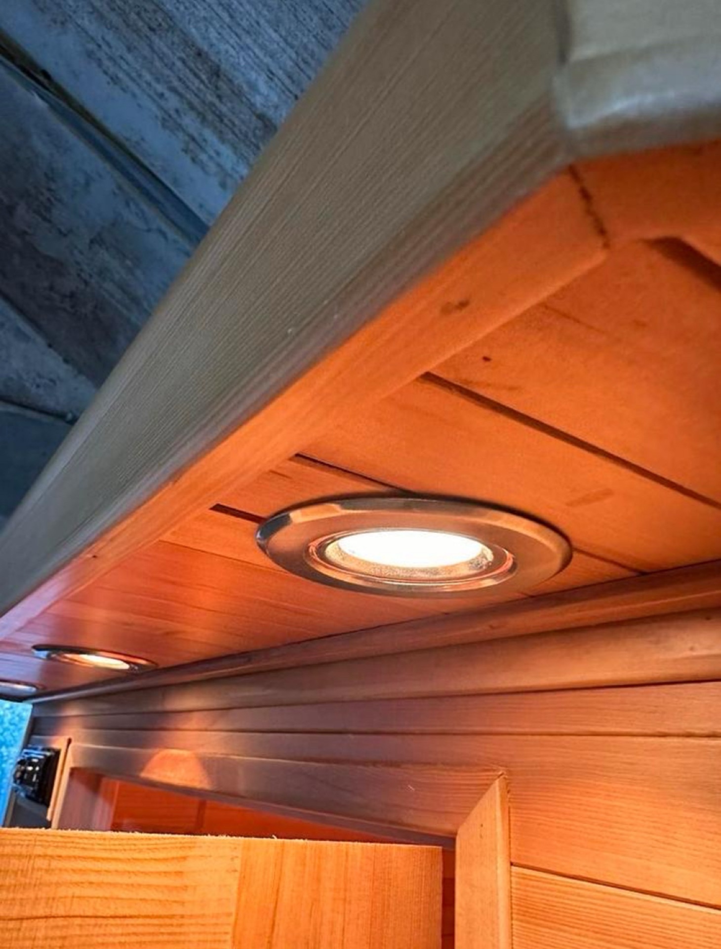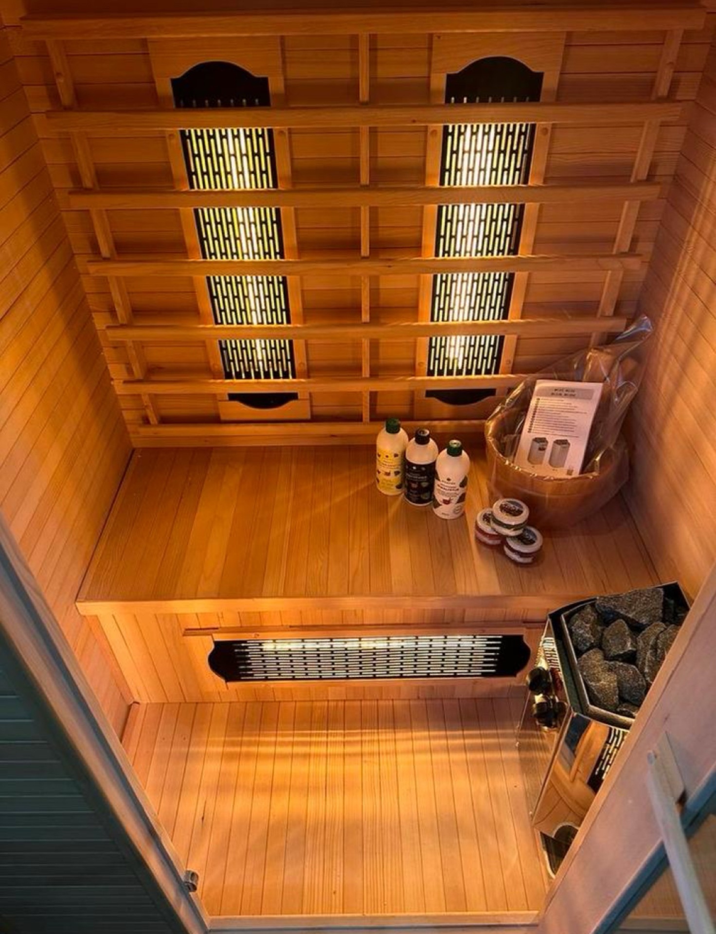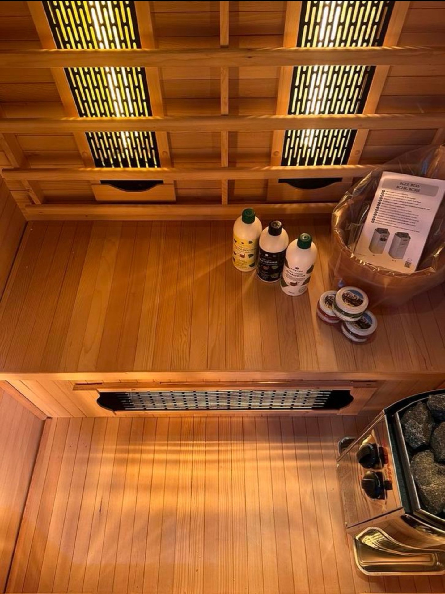 Super combi sauna met full spectrum stralers + finse opgietkachel.