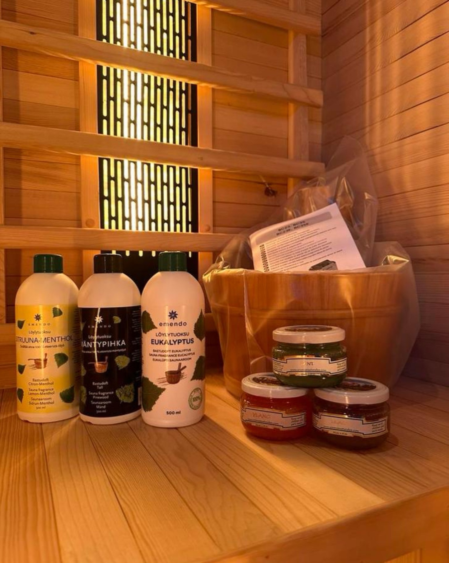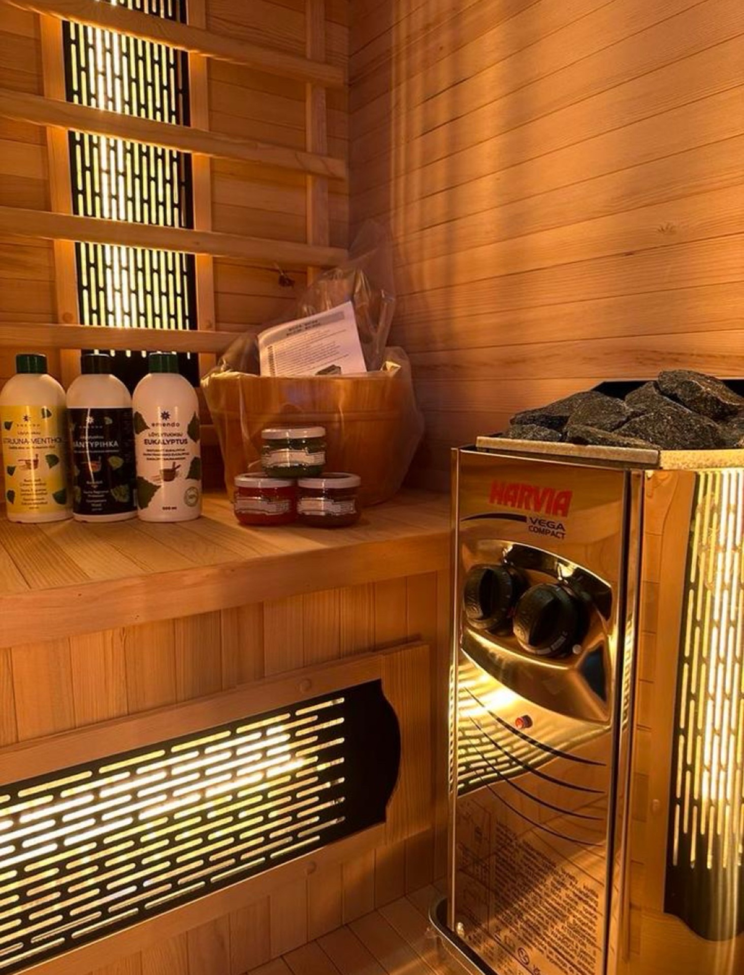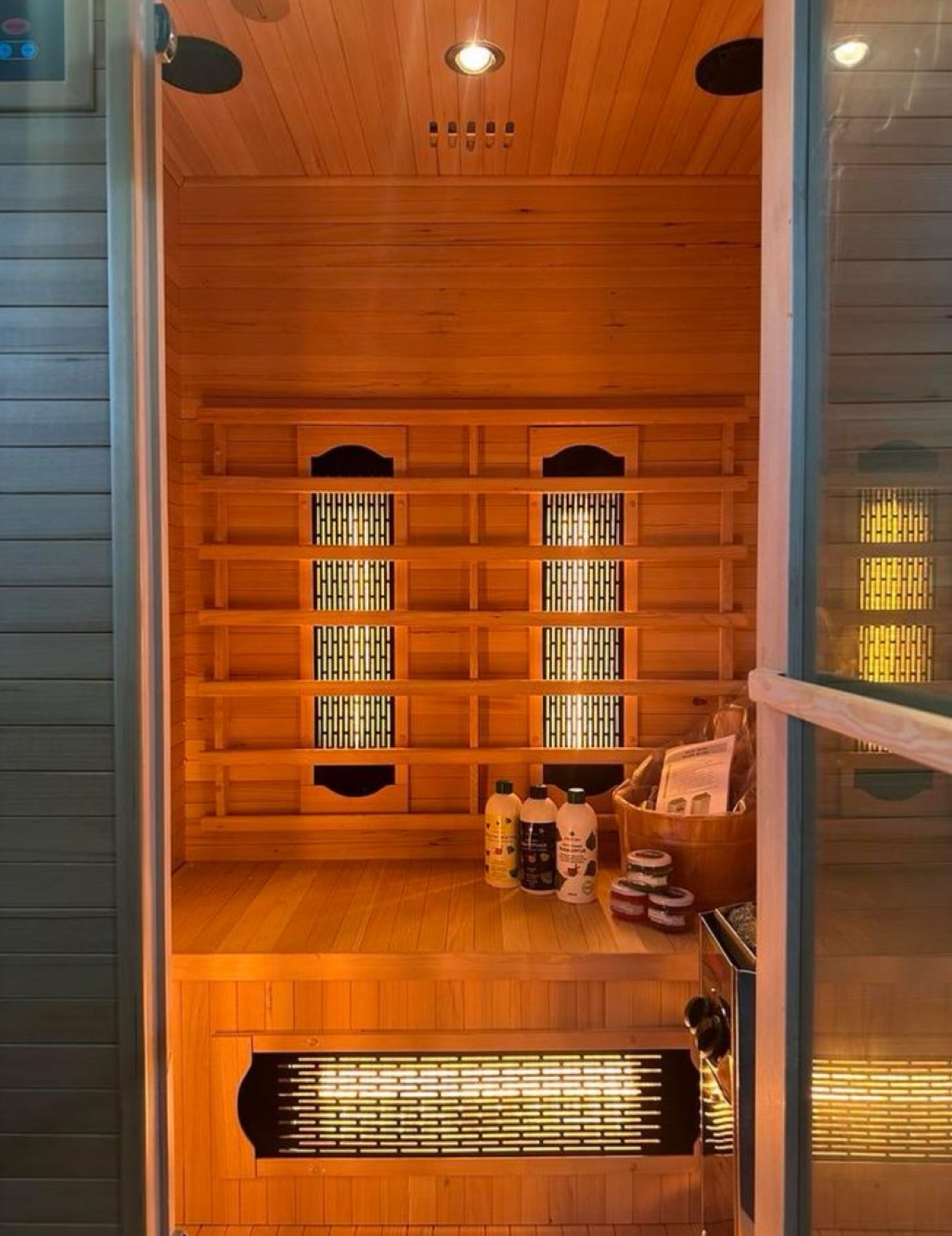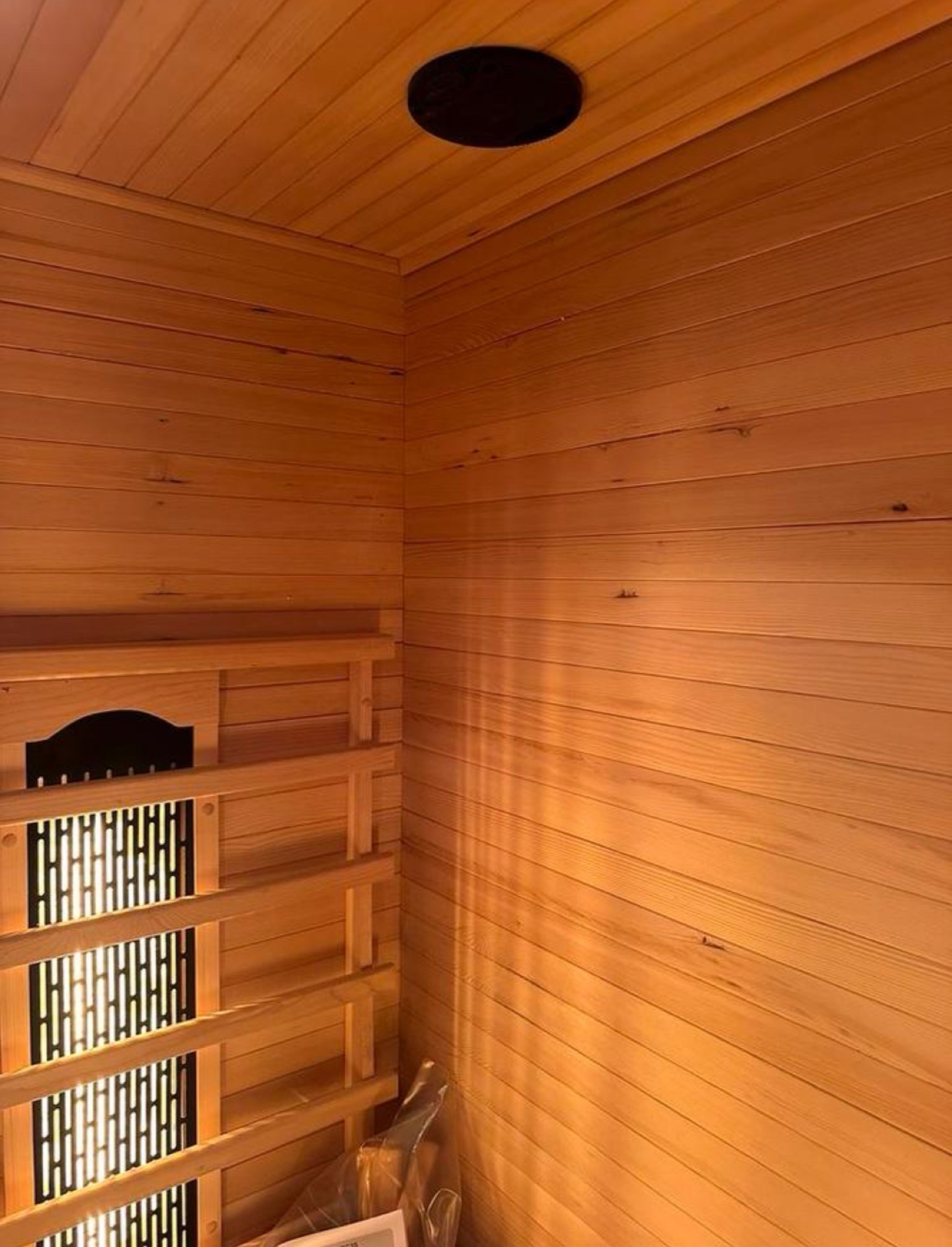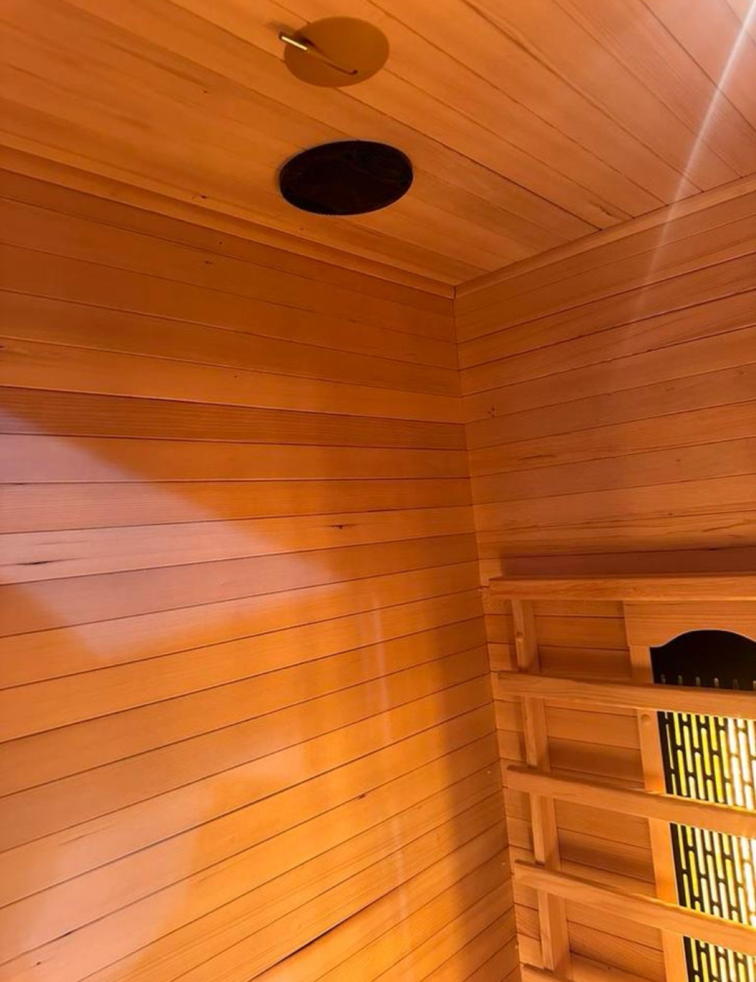 Super combi sauna met full spectrum stralers + finse opgietkachel.