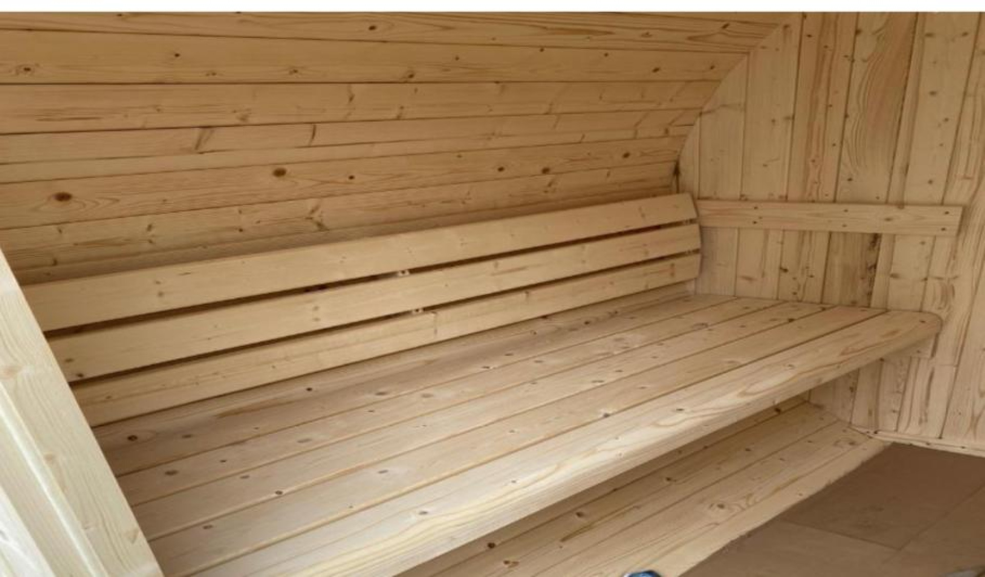 Binnen zijn twee volledig ingelijste banken. Een saunalamp zorgt ook voor een aangename verlichting.